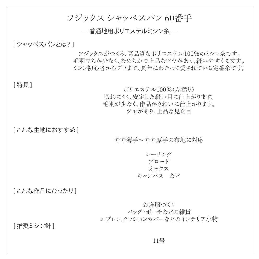 フジックス シャッペスパン 60番手 ― 普通地用ポリエステルミシン糸 ― [ シャッペスパンとは? ] フジックスがつくる、高品質なポリエステル100%のミシン糸です。 毛羽立ちが少なく、なめらかで上品なツヤがあり、縫いやすくて丈夫。 ミシン初心者からプロまで、長年にわたって愛されている定番糸です。 [ ほかのカラーもあります ][ Different colors ] 100% POLYESTER MADE IN JAPAN