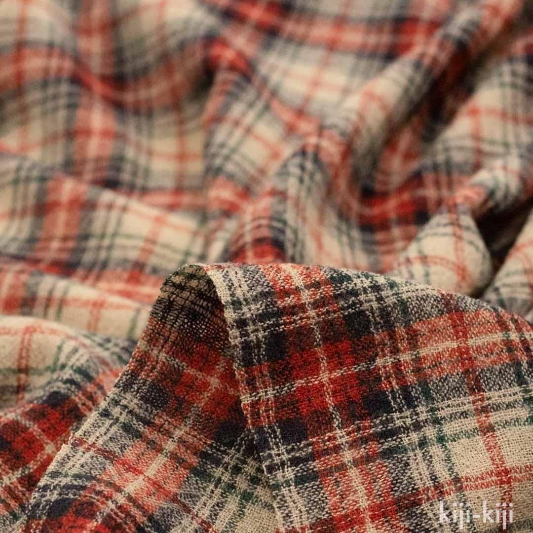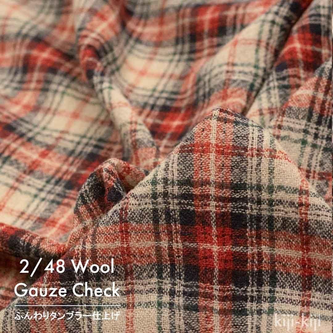 ウール100%の梳毛の48番手双糸を使用して織ったウールガーゼチェックです。