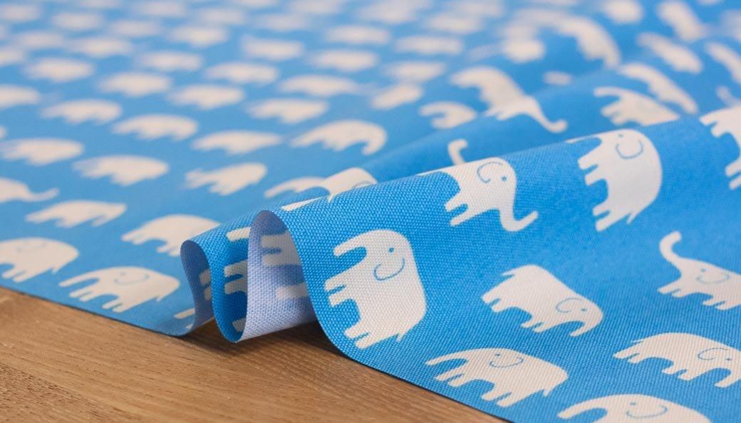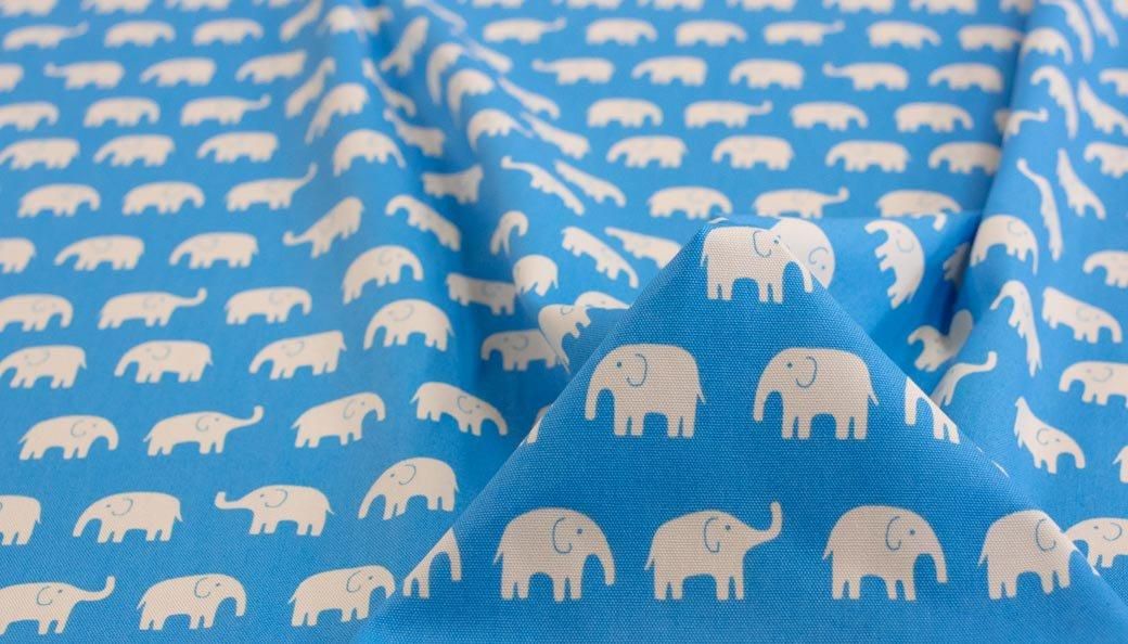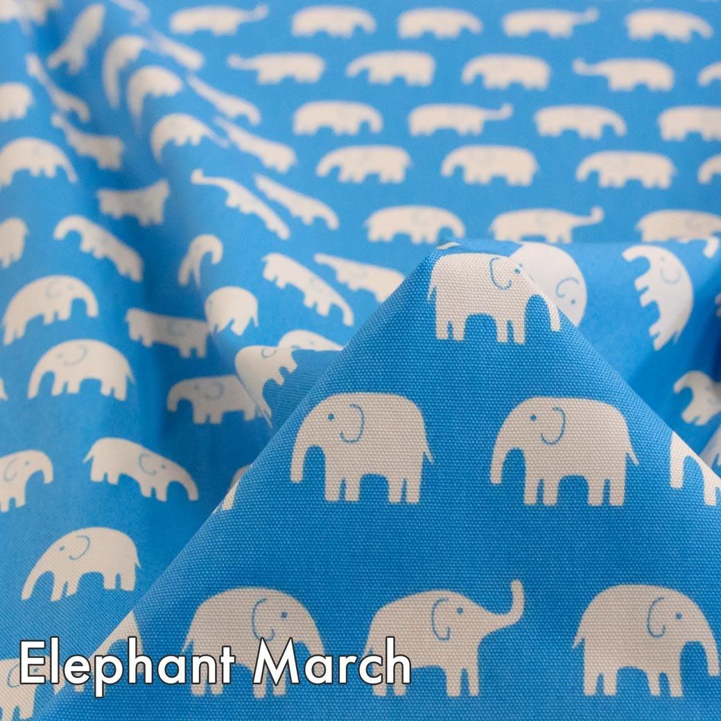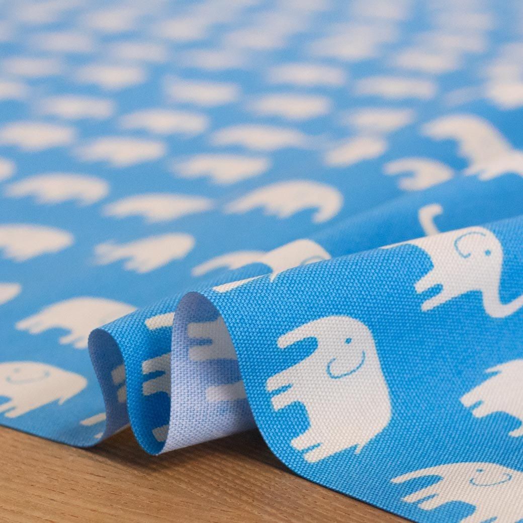 ゾウたちが仲よく並んで歩く姿の楽しいデザインのコットンオックス生地。