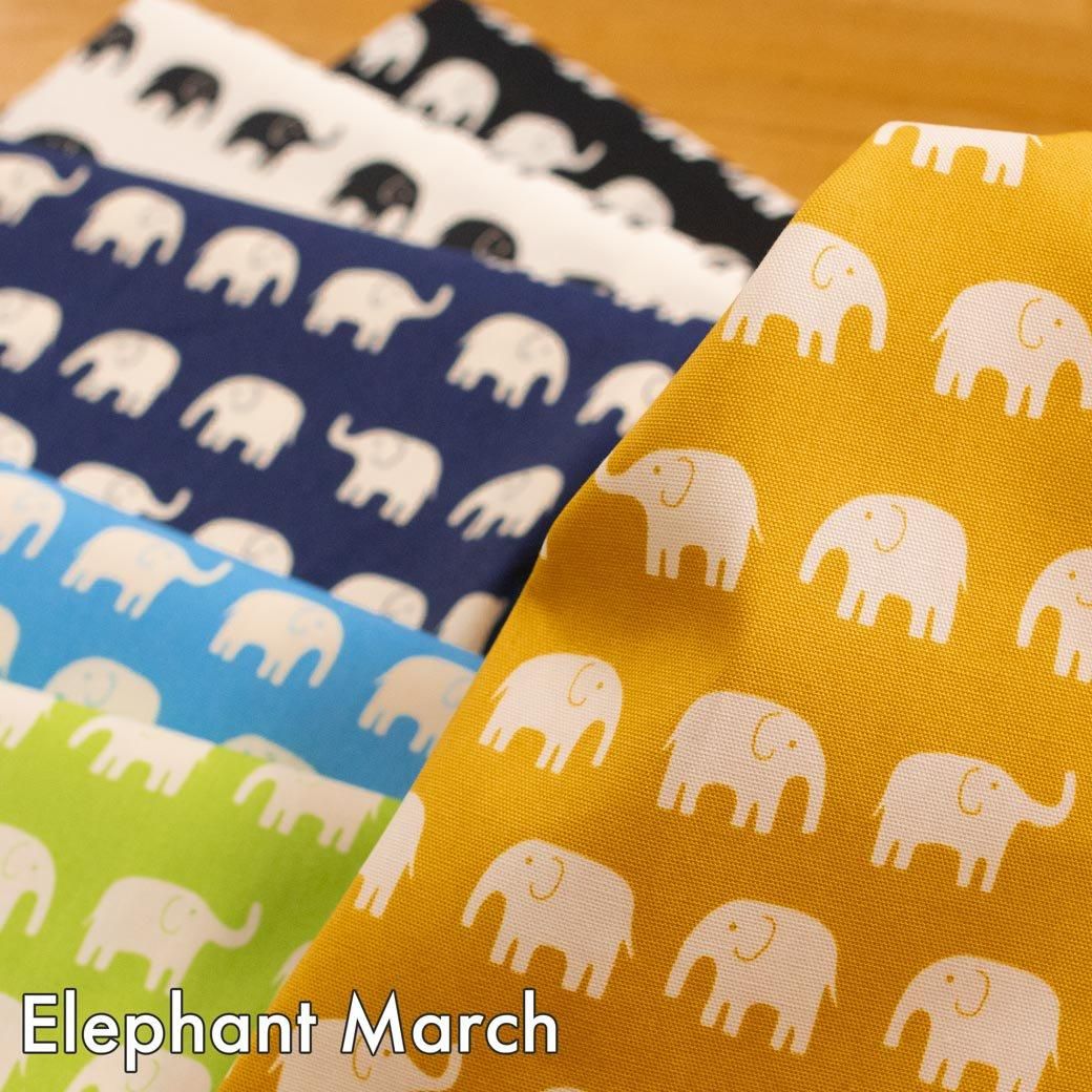 シンプルな単色の背景に単色のゾウが行進するようなパターンで、ナチュラルで使いやすい仕上がりです。