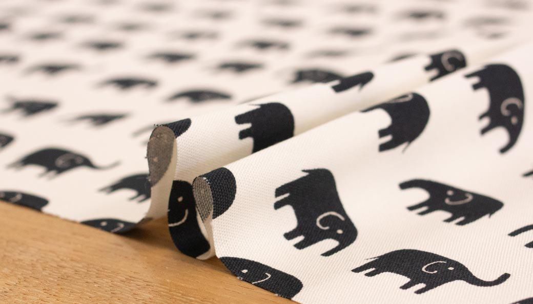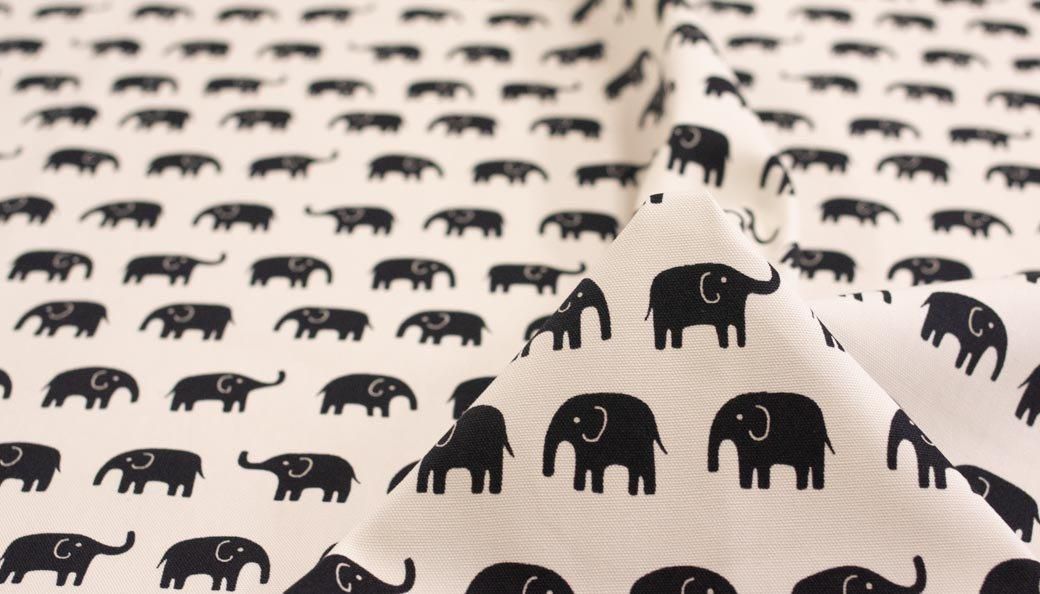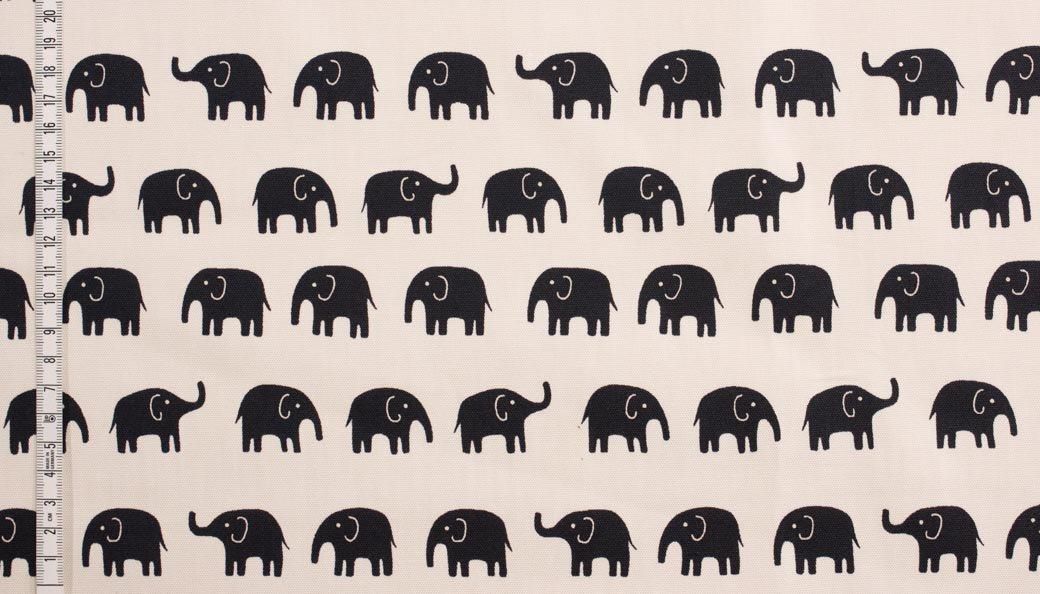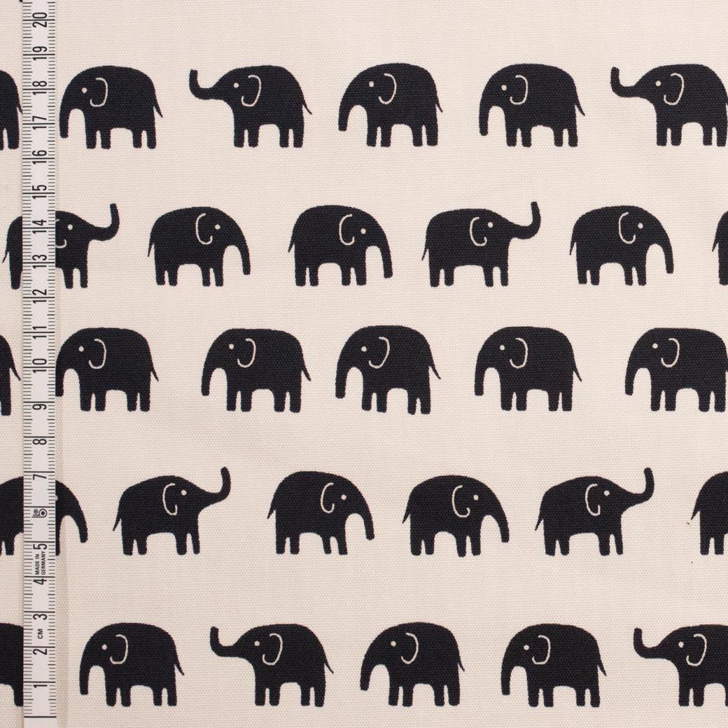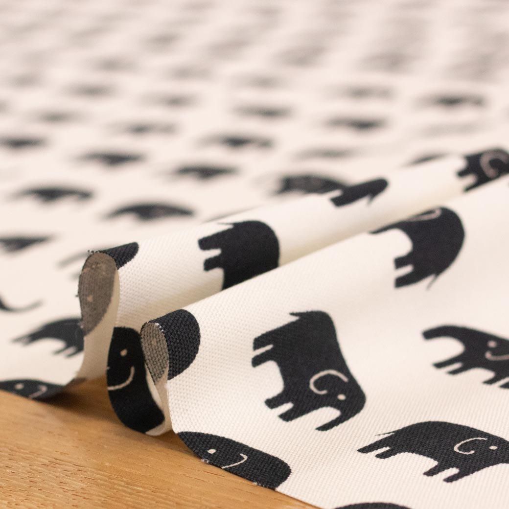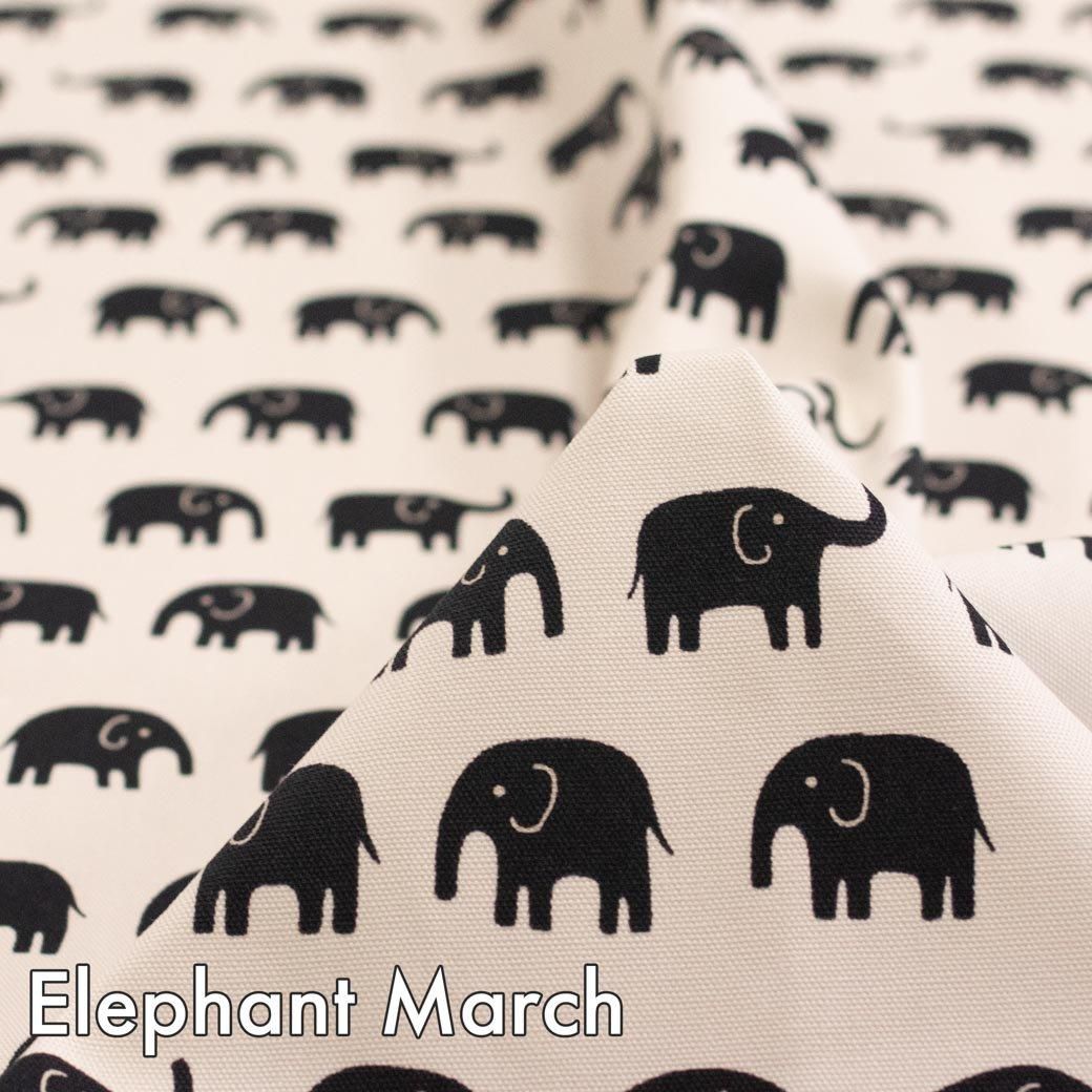 ゾウたちが仲よく並んで歩く姿の楽しいデザインのコットンオックス生地。