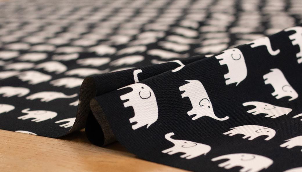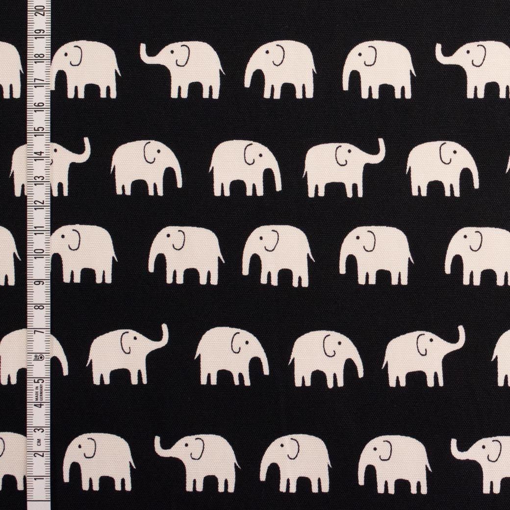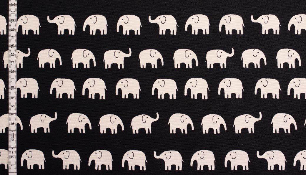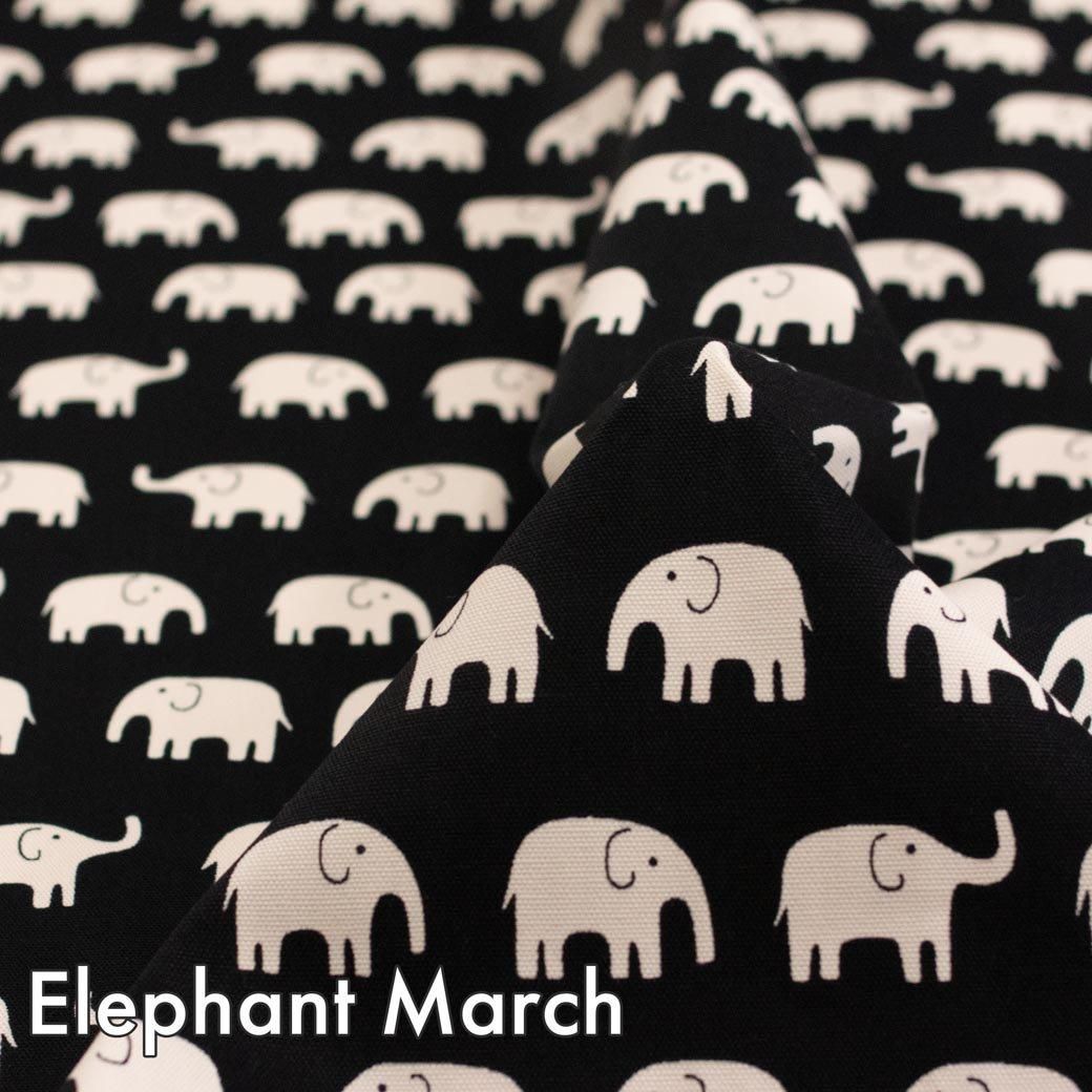 ゾウたちが仲よく並んで歩く姿の楽しいデザインのコットンオックス生地。