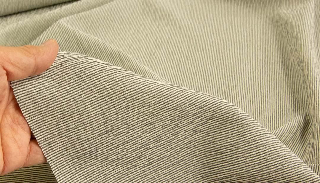 横糸にポリウレタンを混紡することで、くしゅっと縮めたシャーリング加工の楊柳タッチのストライプ生地です。
