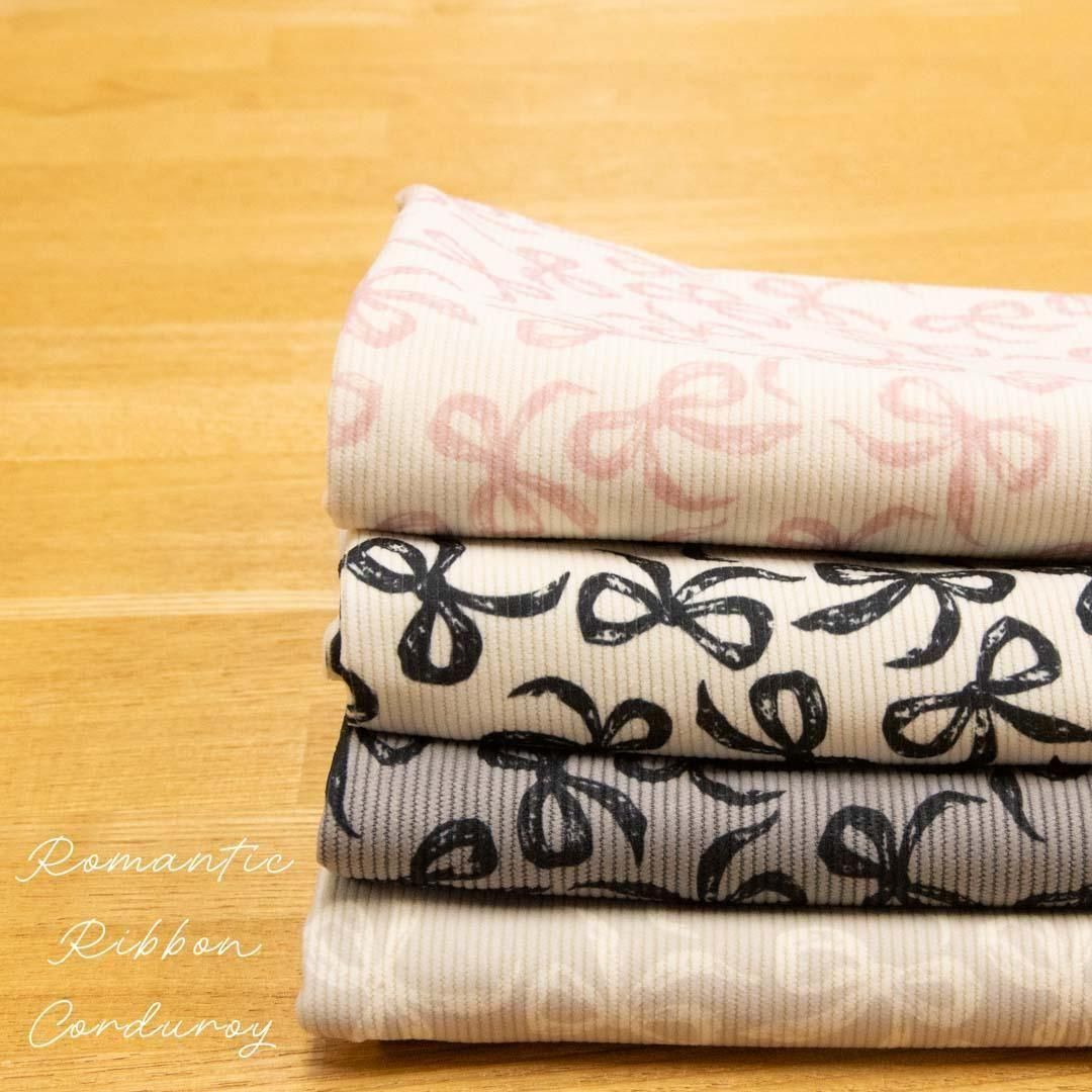 ロマンティックなリボンがちりばめられた、細畝のコーデュロイ生地
