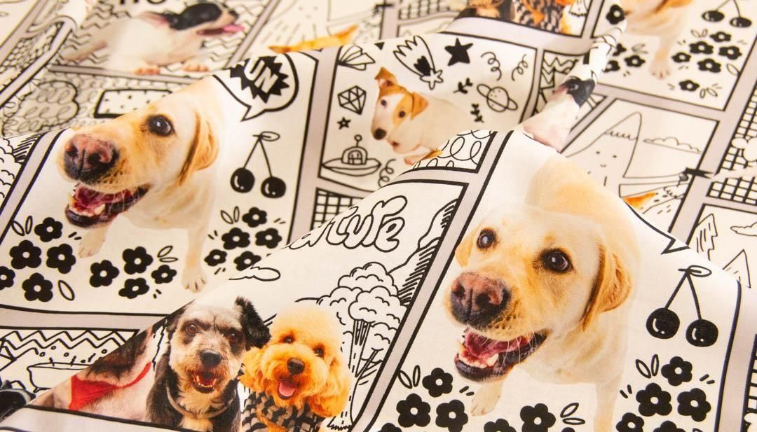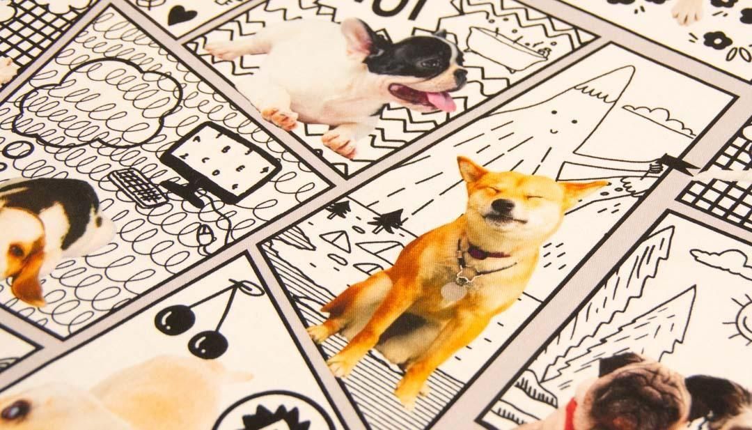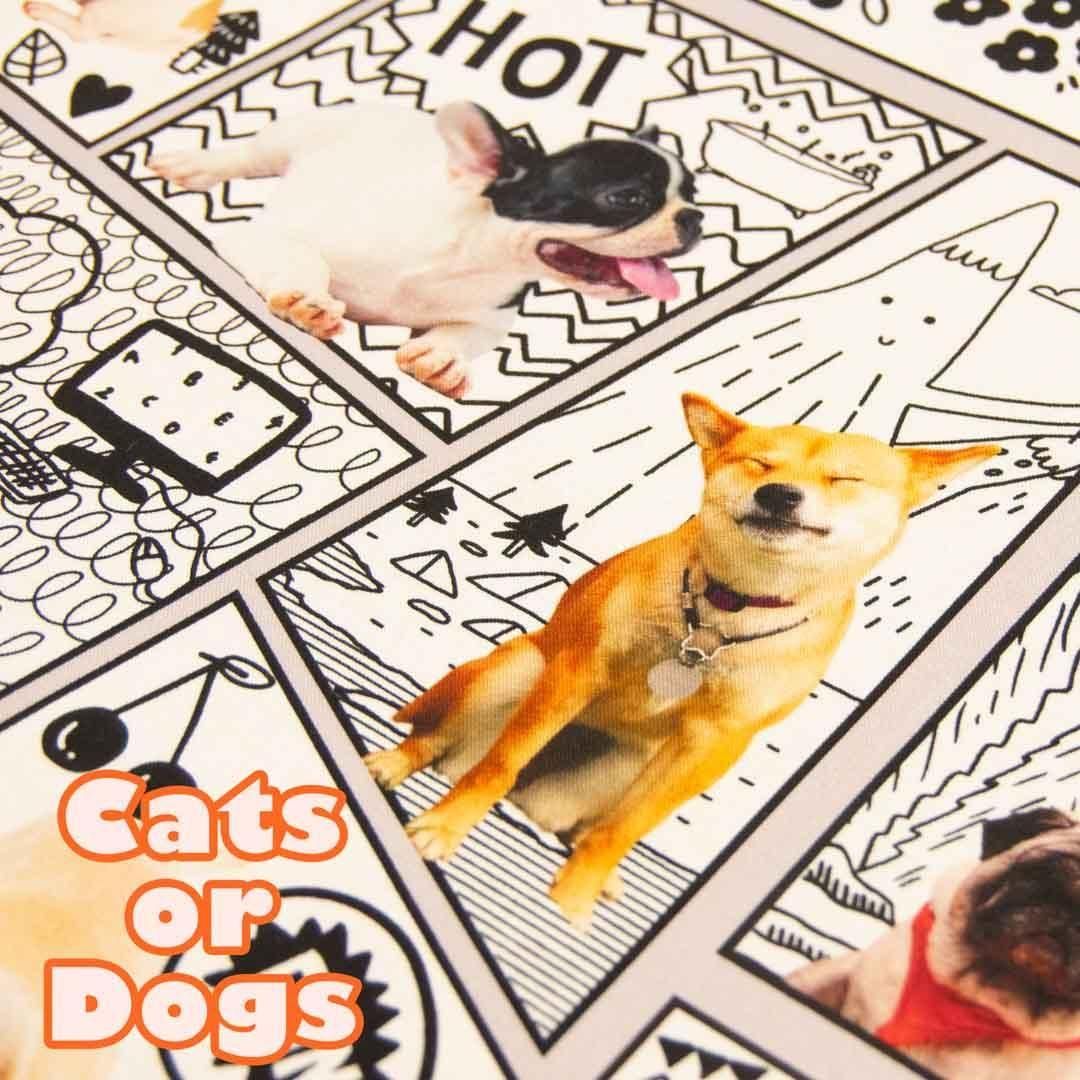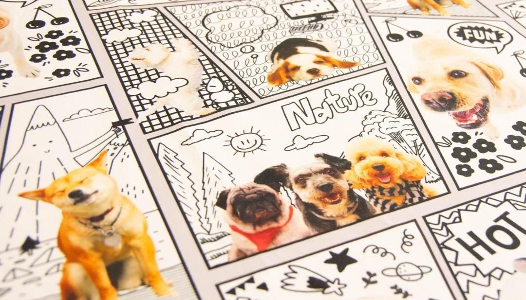 インクジェットプリントならではの表現で、いろいろな猫や犬たちがコミックの中に登場