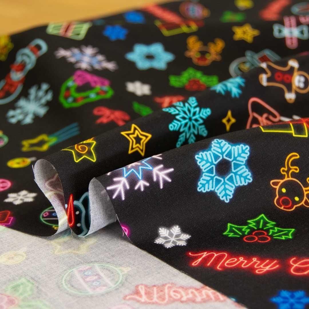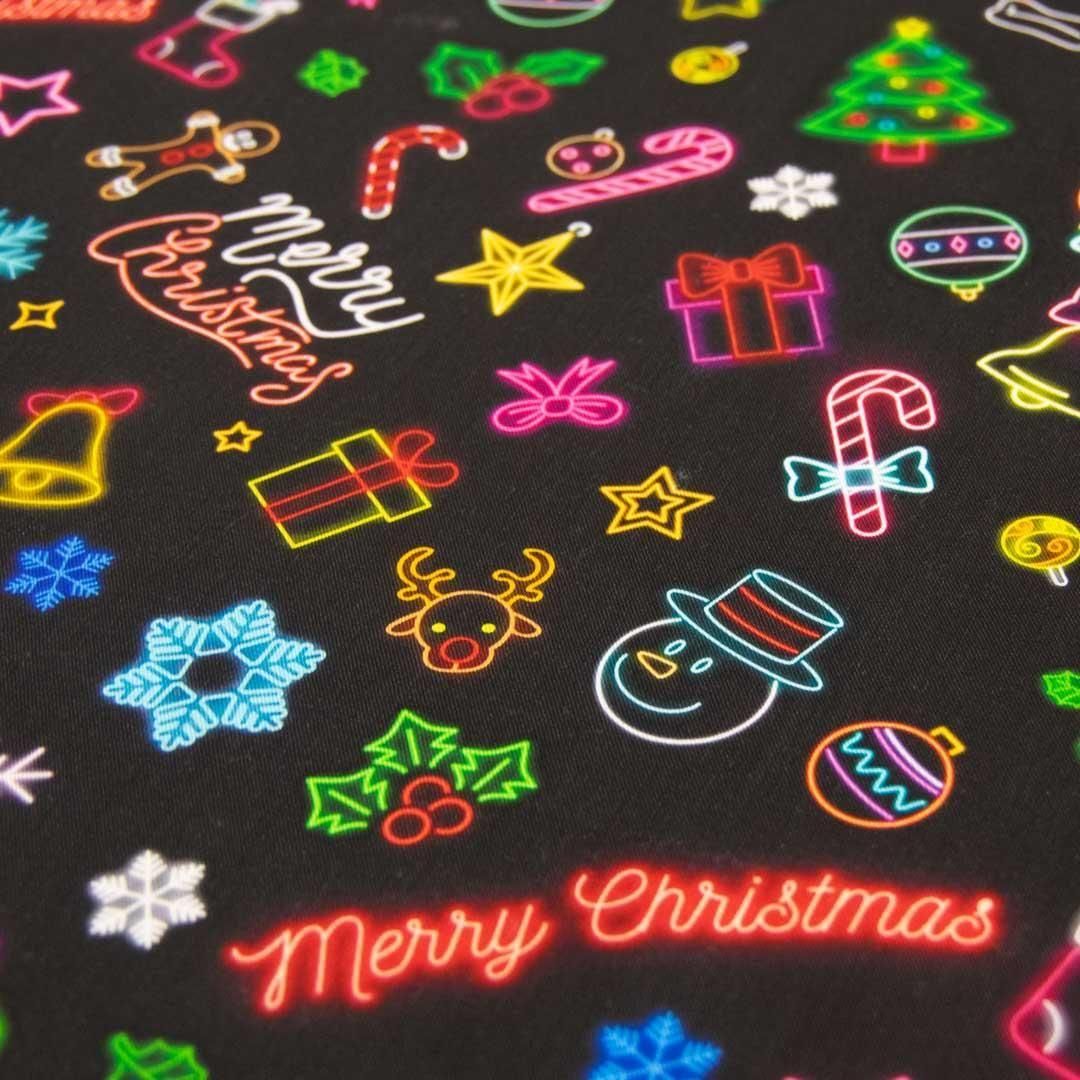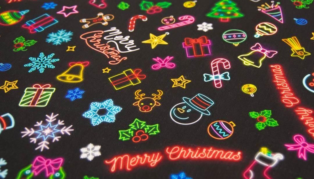 ネオン管で描かれたようなクリスマスモチーフが並ぶ、ポップで遊び心のあるデザイン。