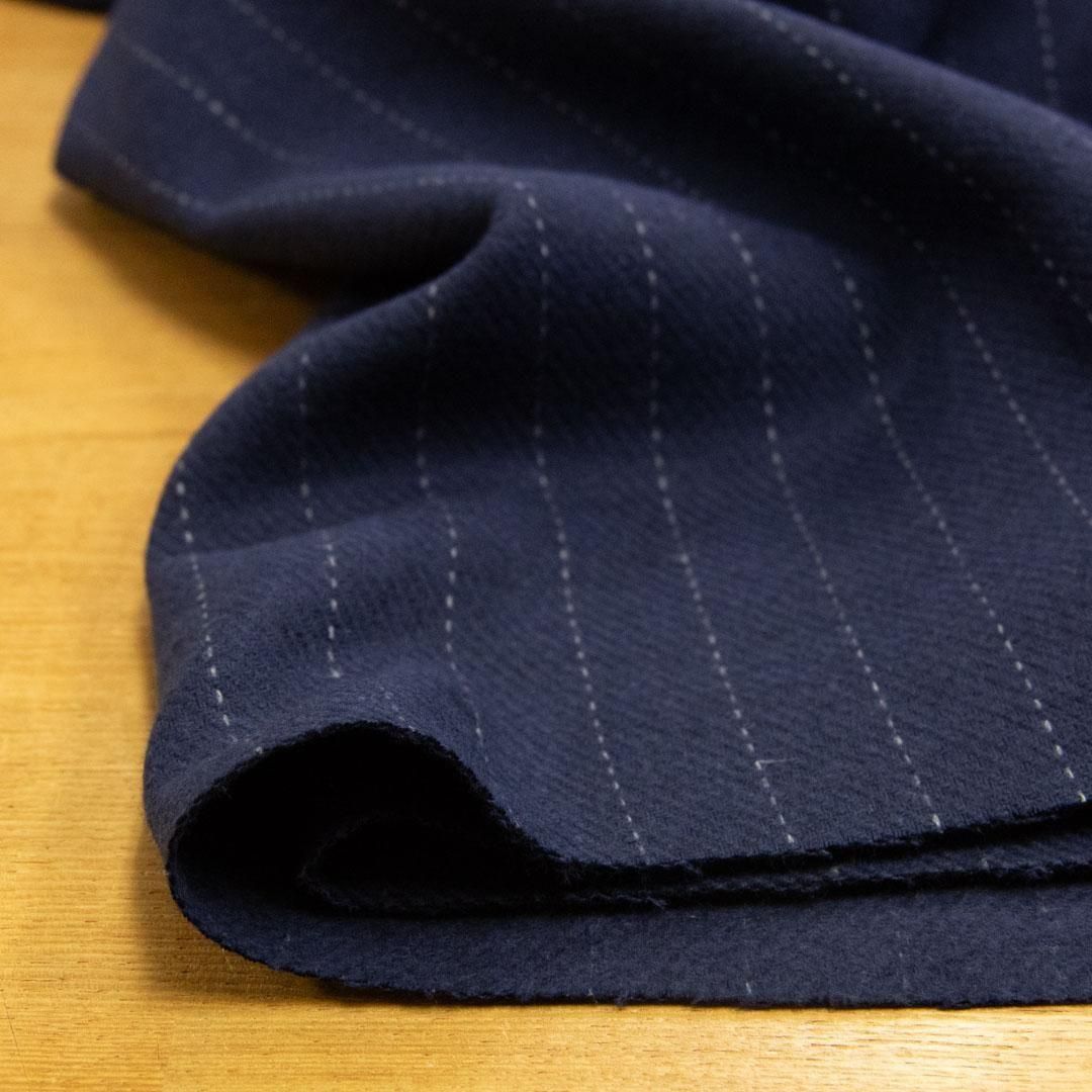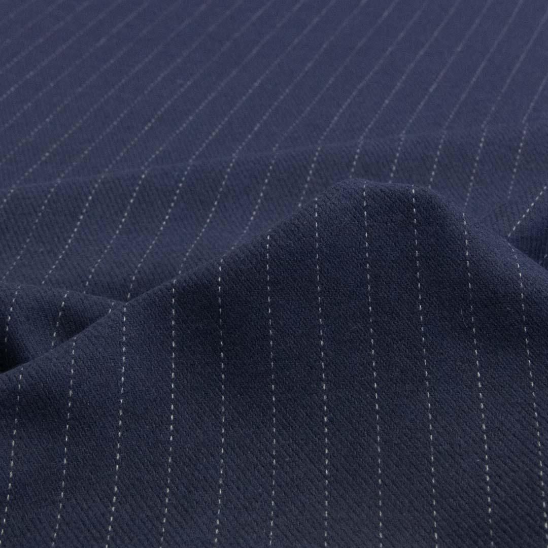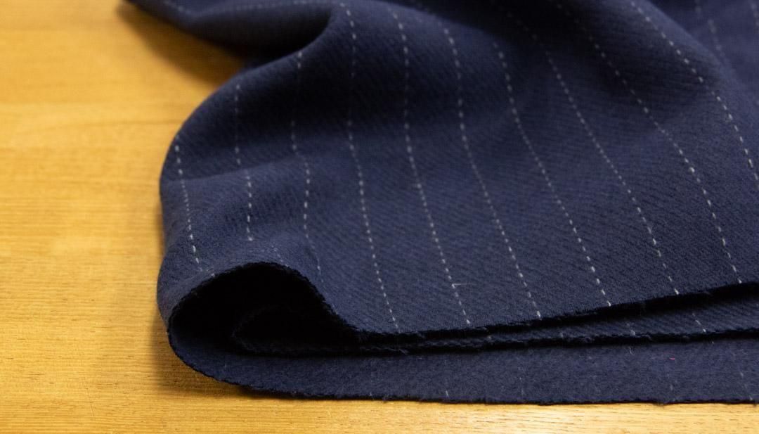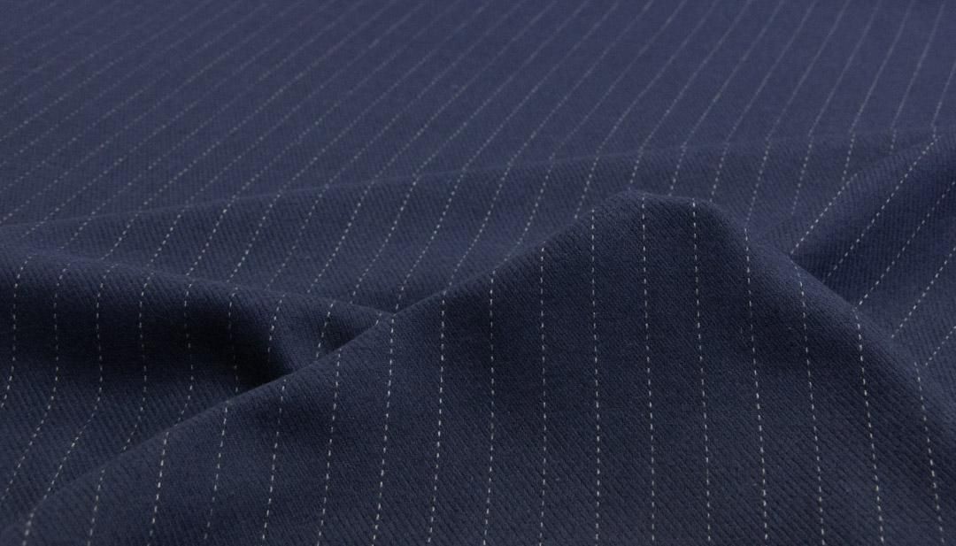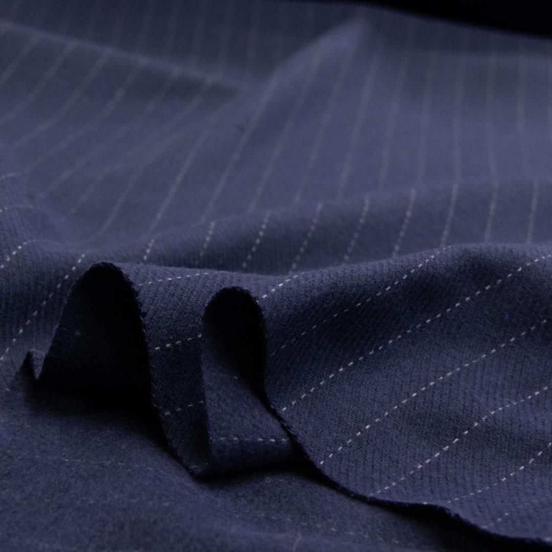 ネイビーの地色にグレーのペンシルストライプが走る、落ち着いた雰囲気のウールブレンドカルゼストライプ生地です。