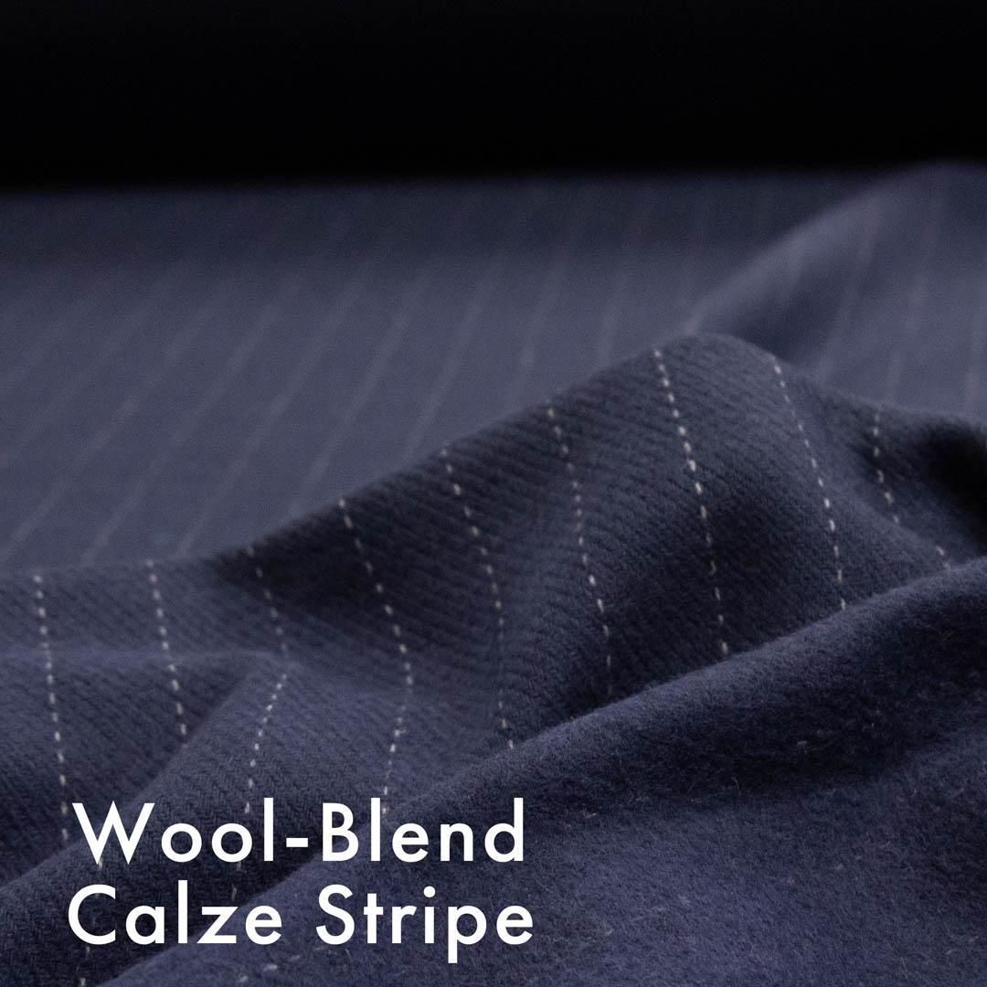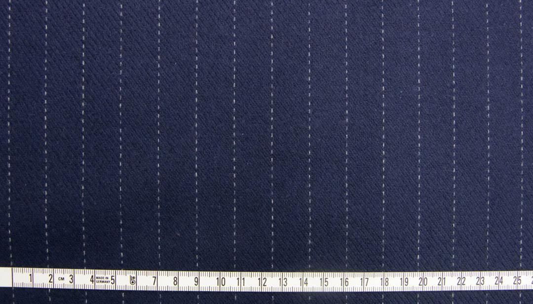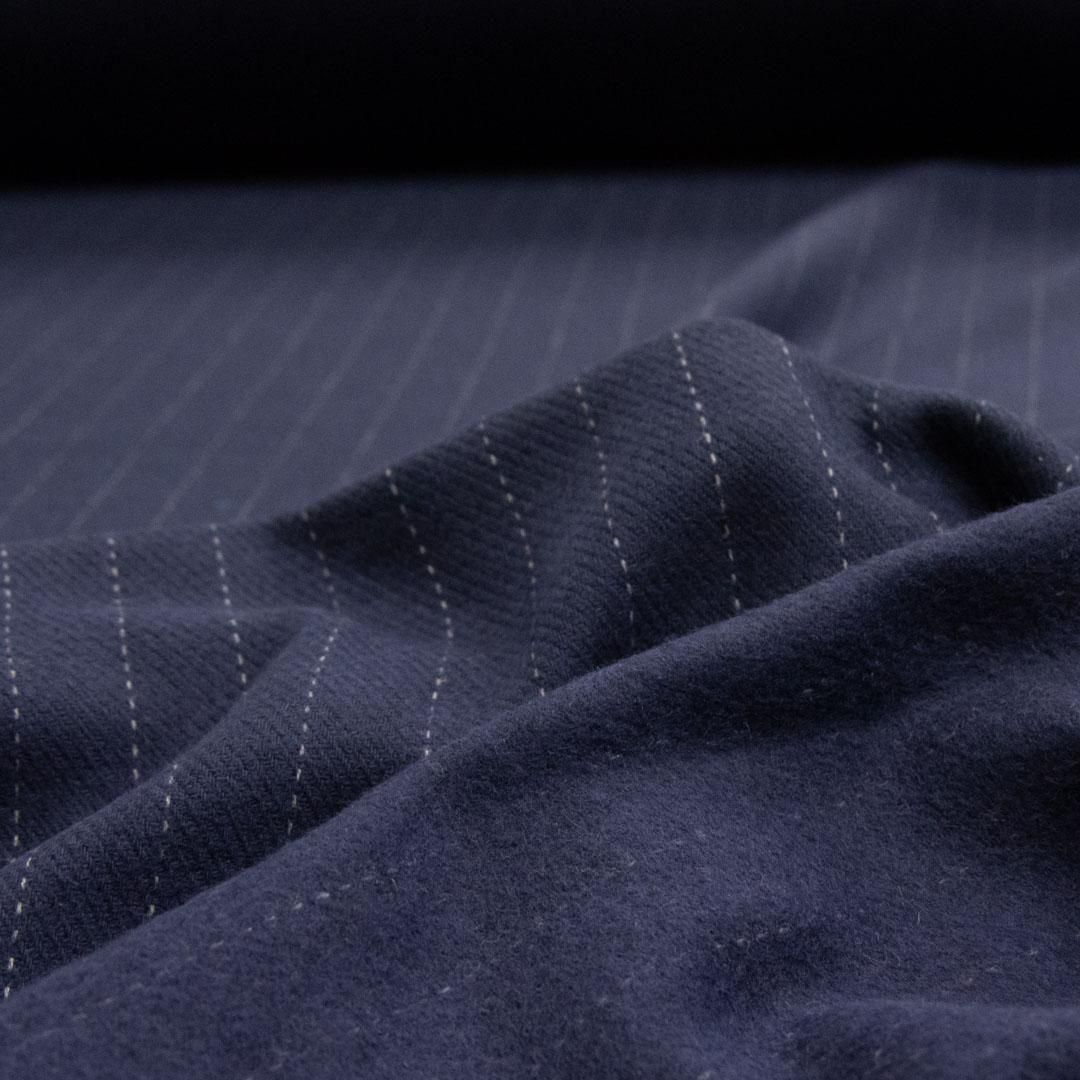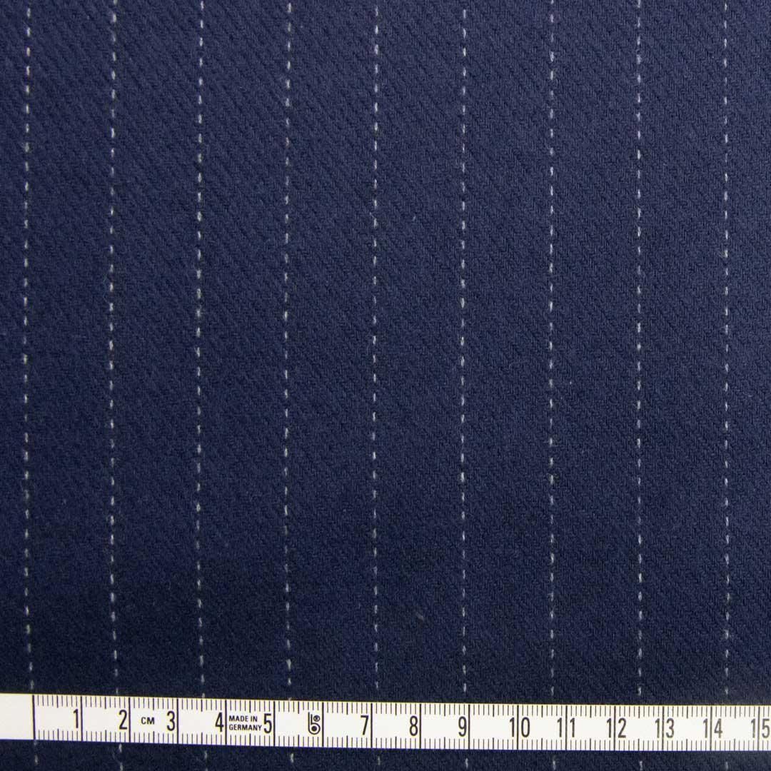 ネイビーの地色にグレーのペンシルストライプが走る、落ち着いた雰囲気のウールブレンドカルゼストライプ生地です。