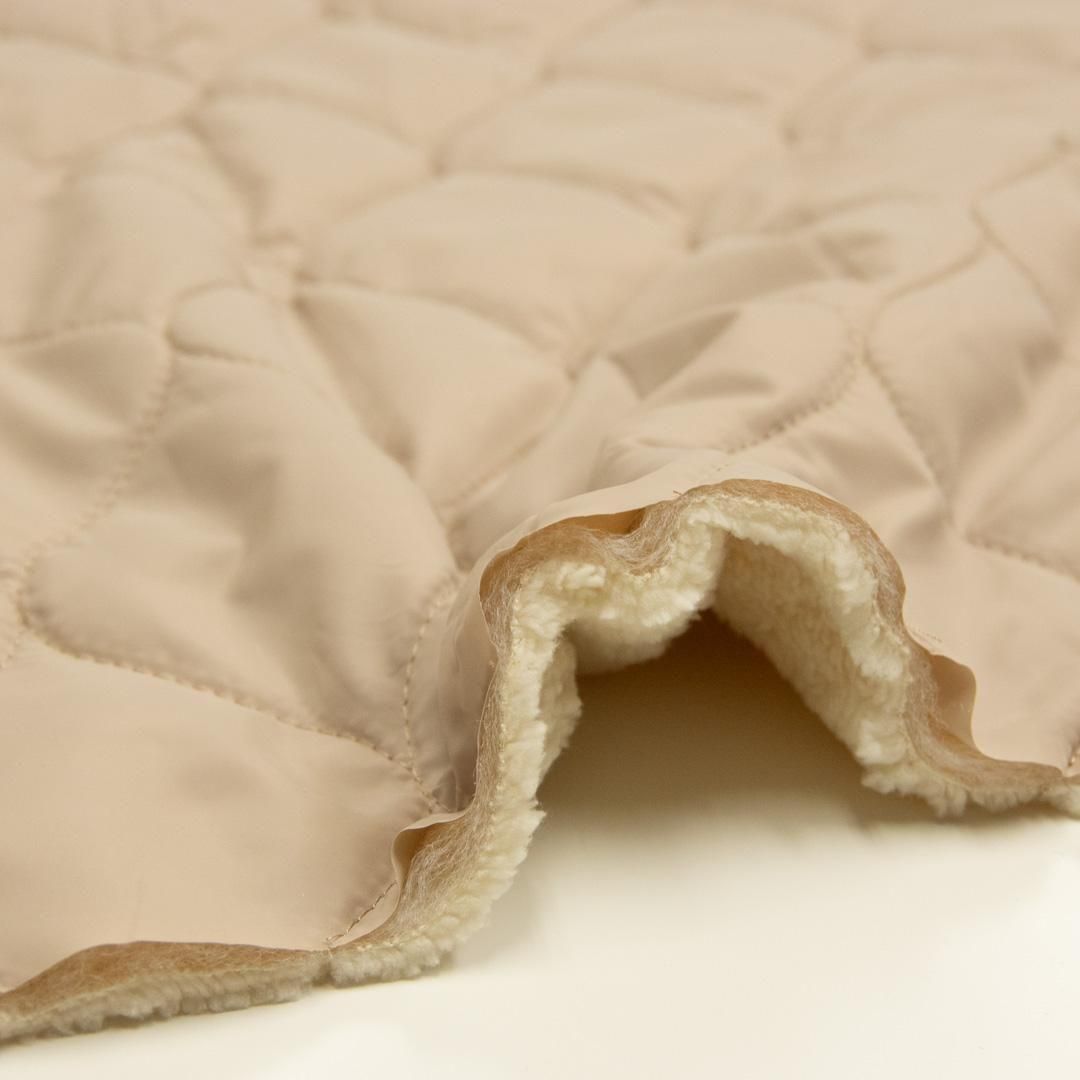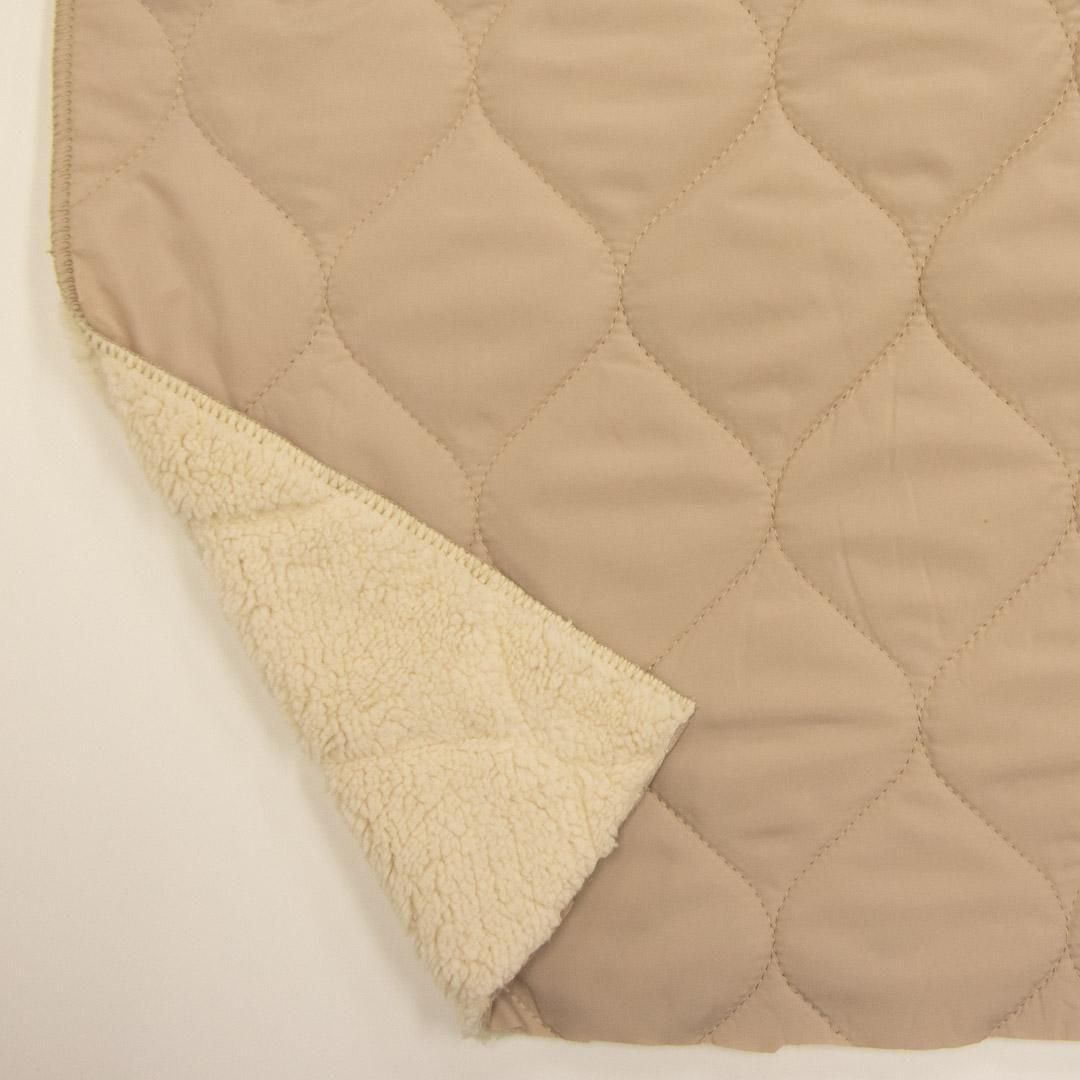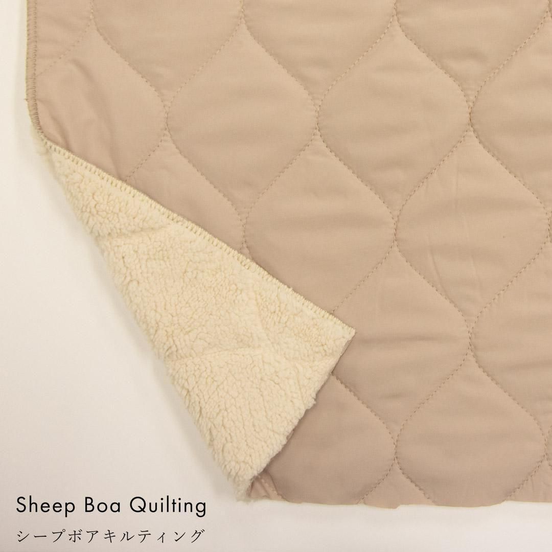表地にはしなやかなポリエステルタフタを使用し、中綿を挟んで裏地にはシープボアを合わせたキルティング生地です。