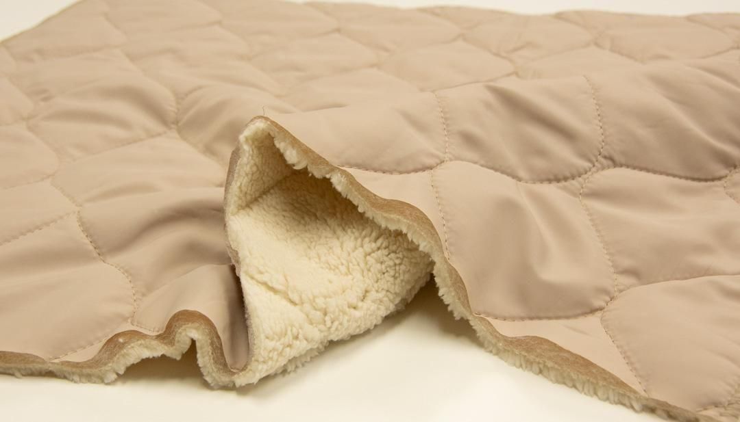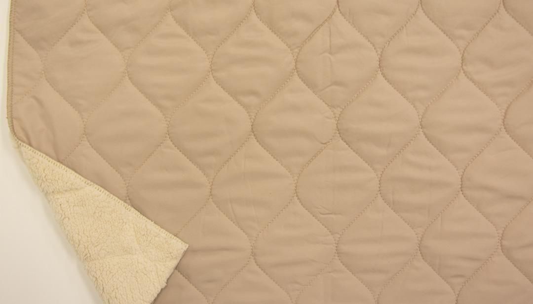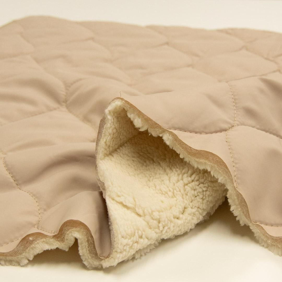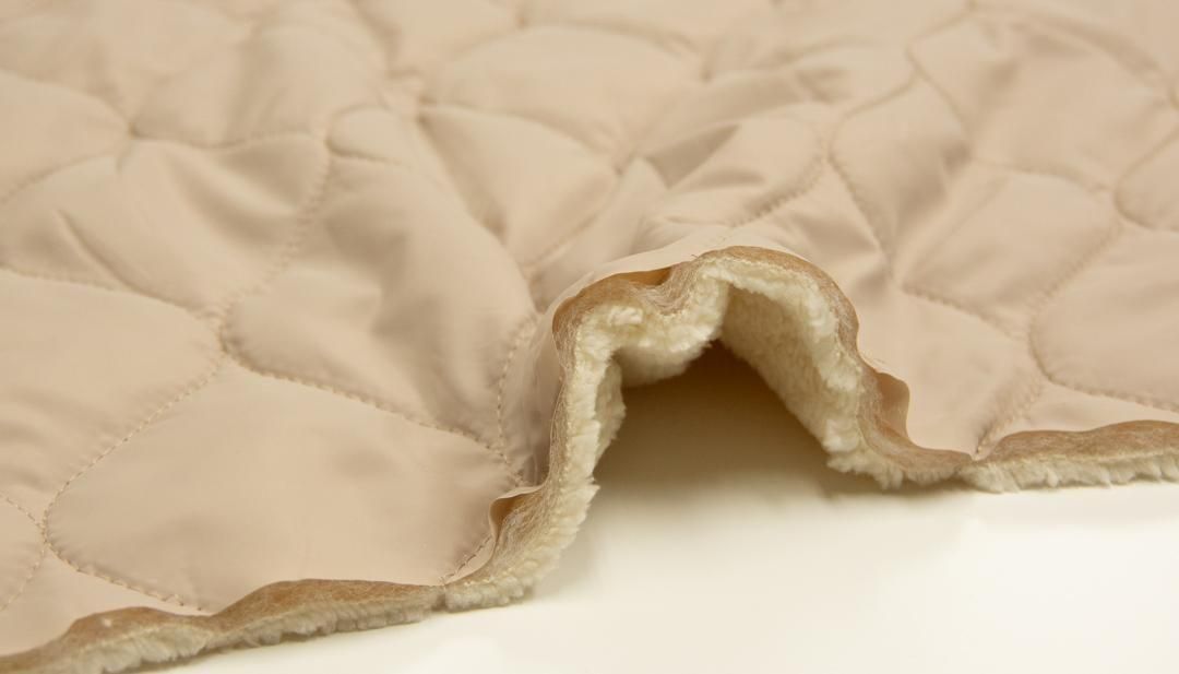 表地にはしなやかなポリエステルタフタを使用し、中綿を挟んで裏地にはシープボアを合わせたキルティング生地です。