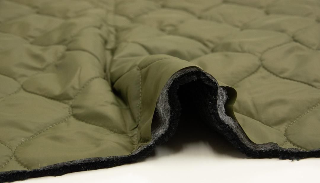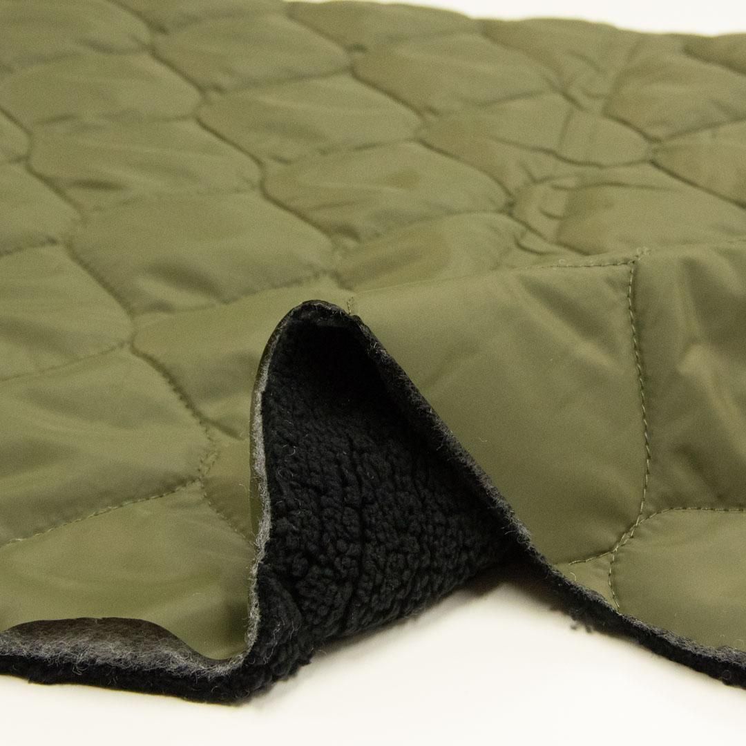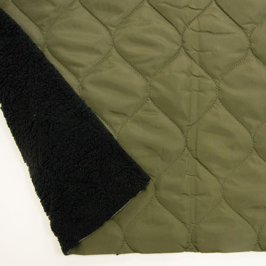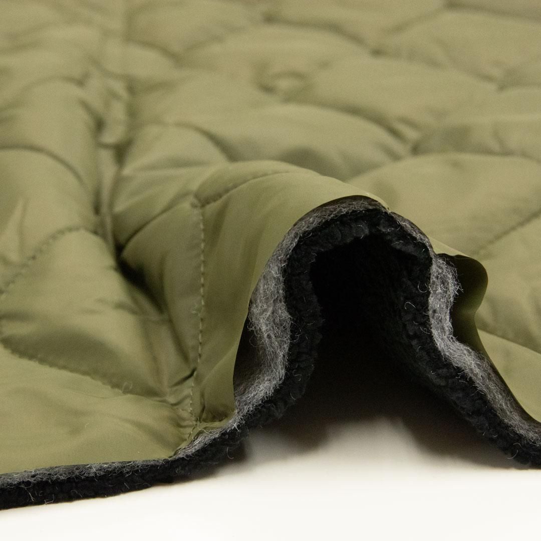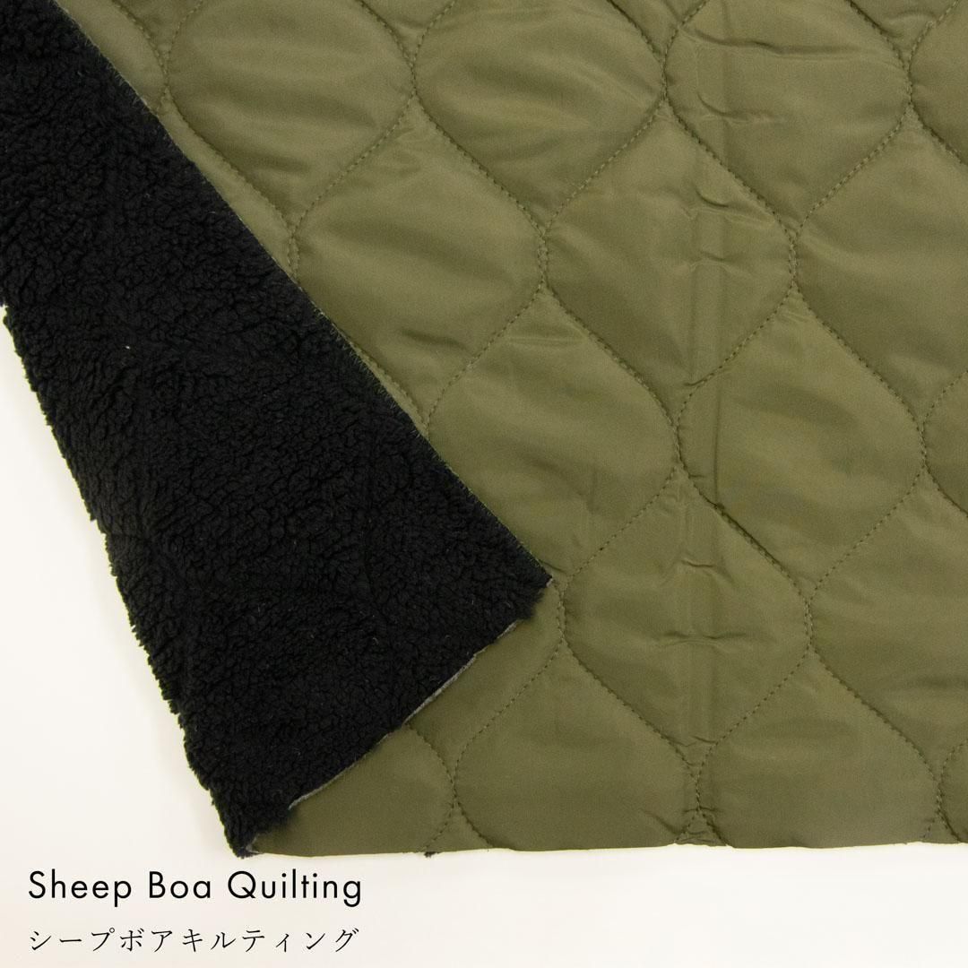 表地にはしなやかなポリエステルタフタを使用し、中綿を挟んで裏地にはシープボアを合わせたキルティング生地です。