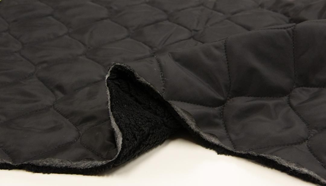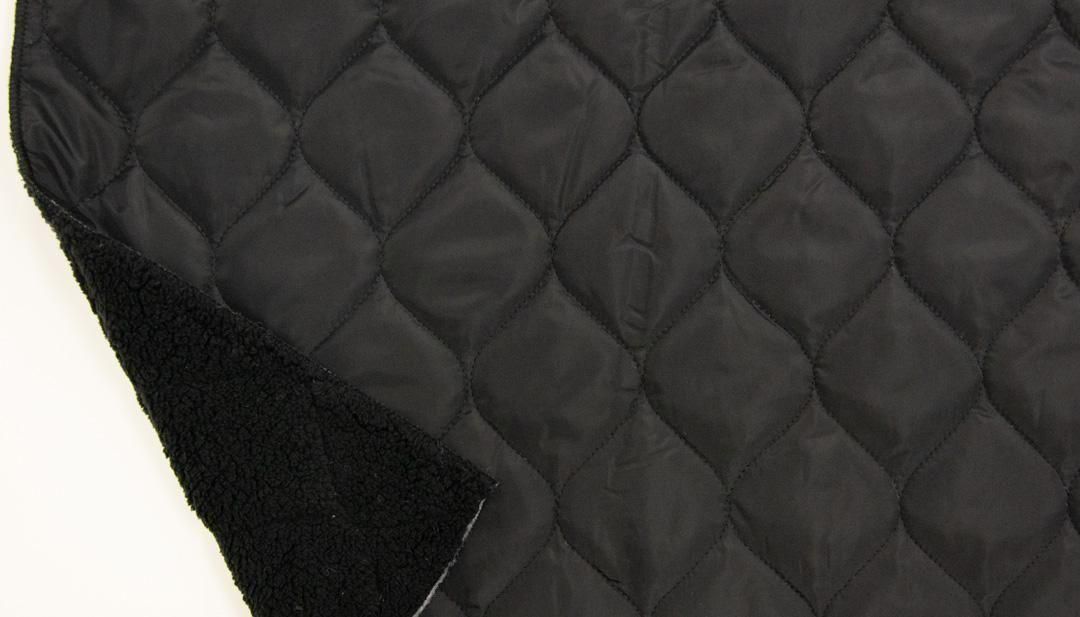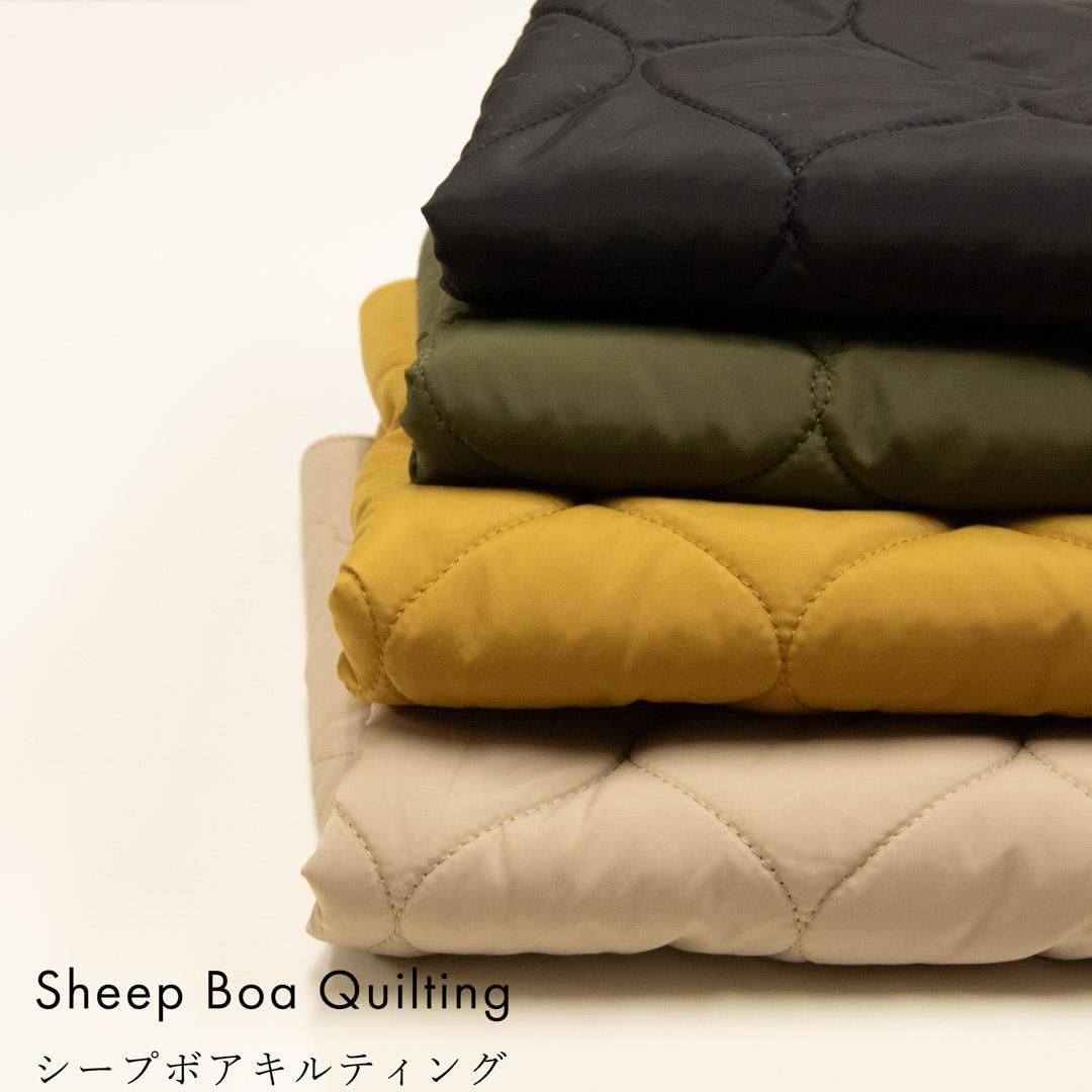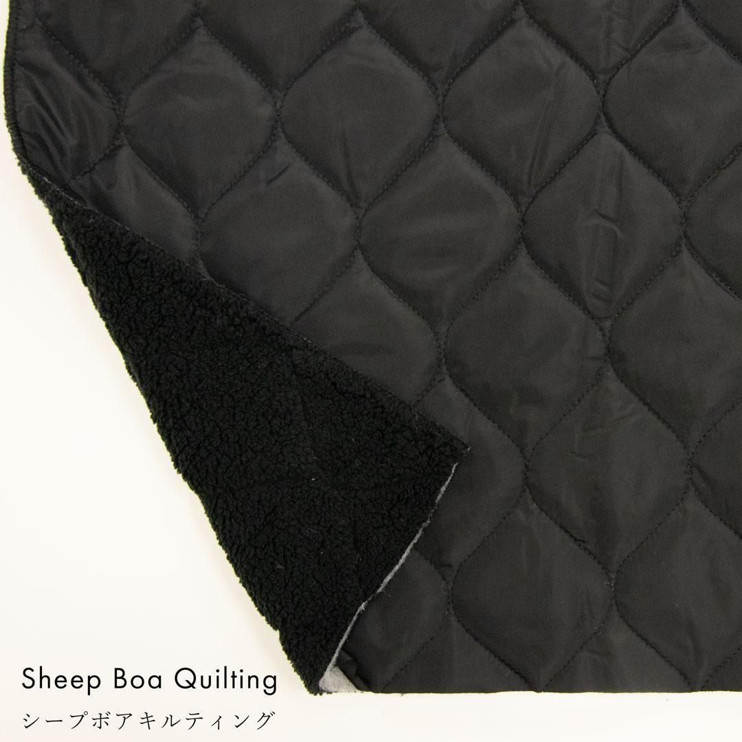 表地にはしなやかなポリエステルタフタを使用し、中綿を挟んで裏地にはシープボアを合わせたキルティング生地です。