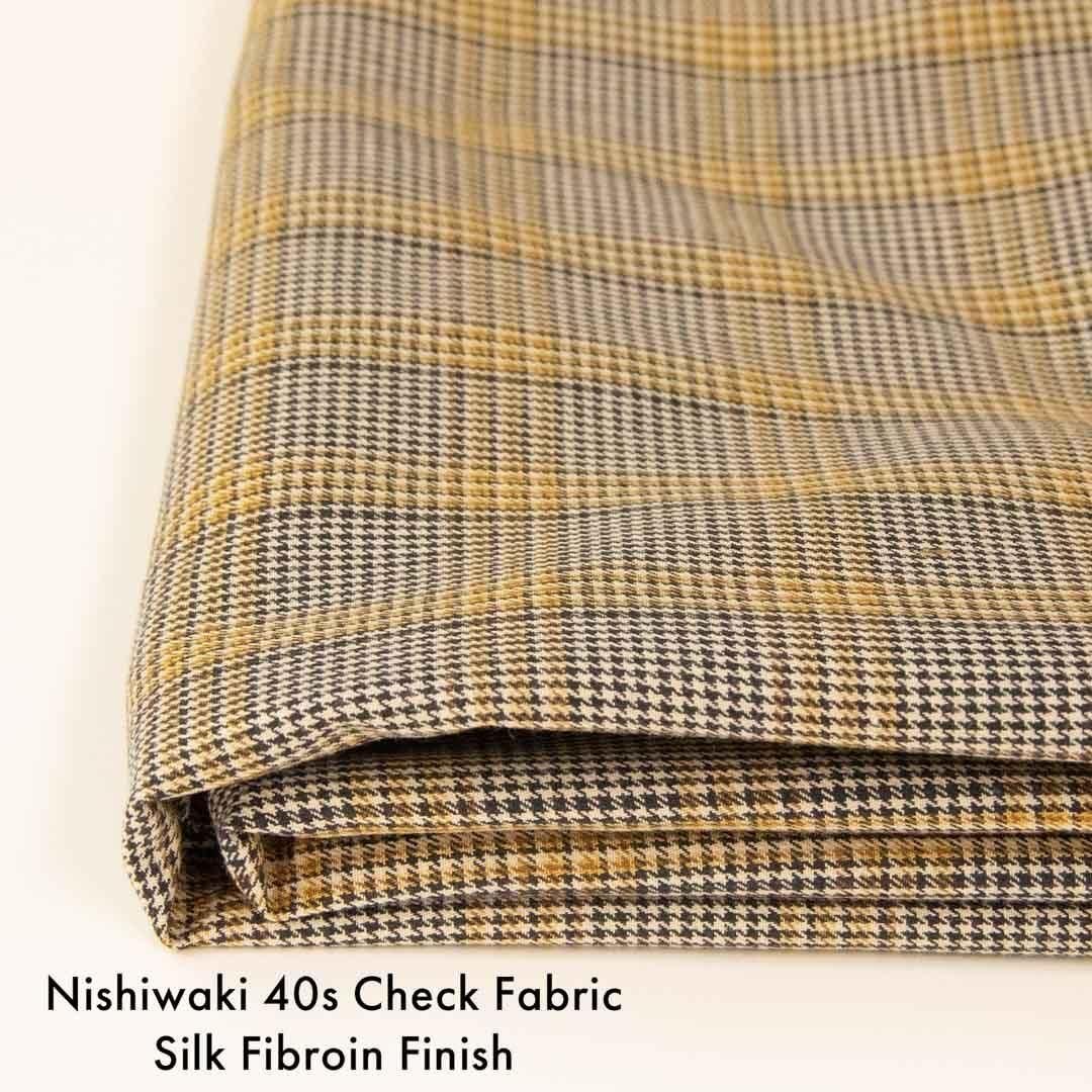 西脇で織った先染め40チェックのSilk Fibroin加工生地です。