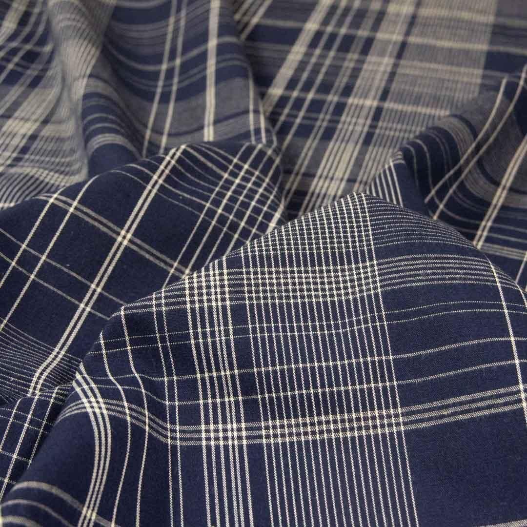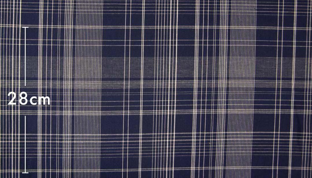 ネイビーにホワイトの細いマルチラインを重ねた、落ち着いた表情のレイヤードチェック