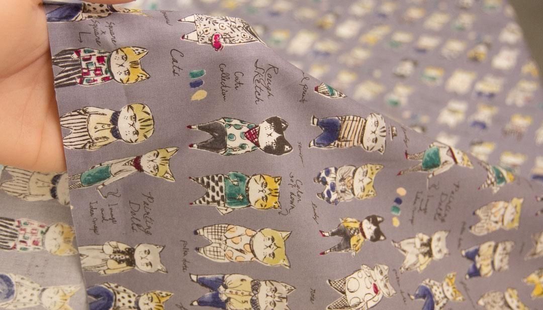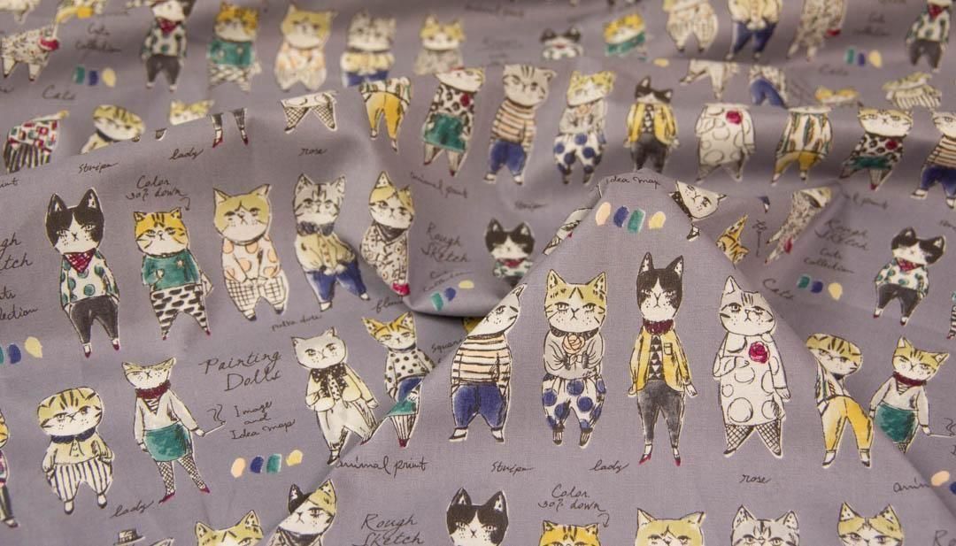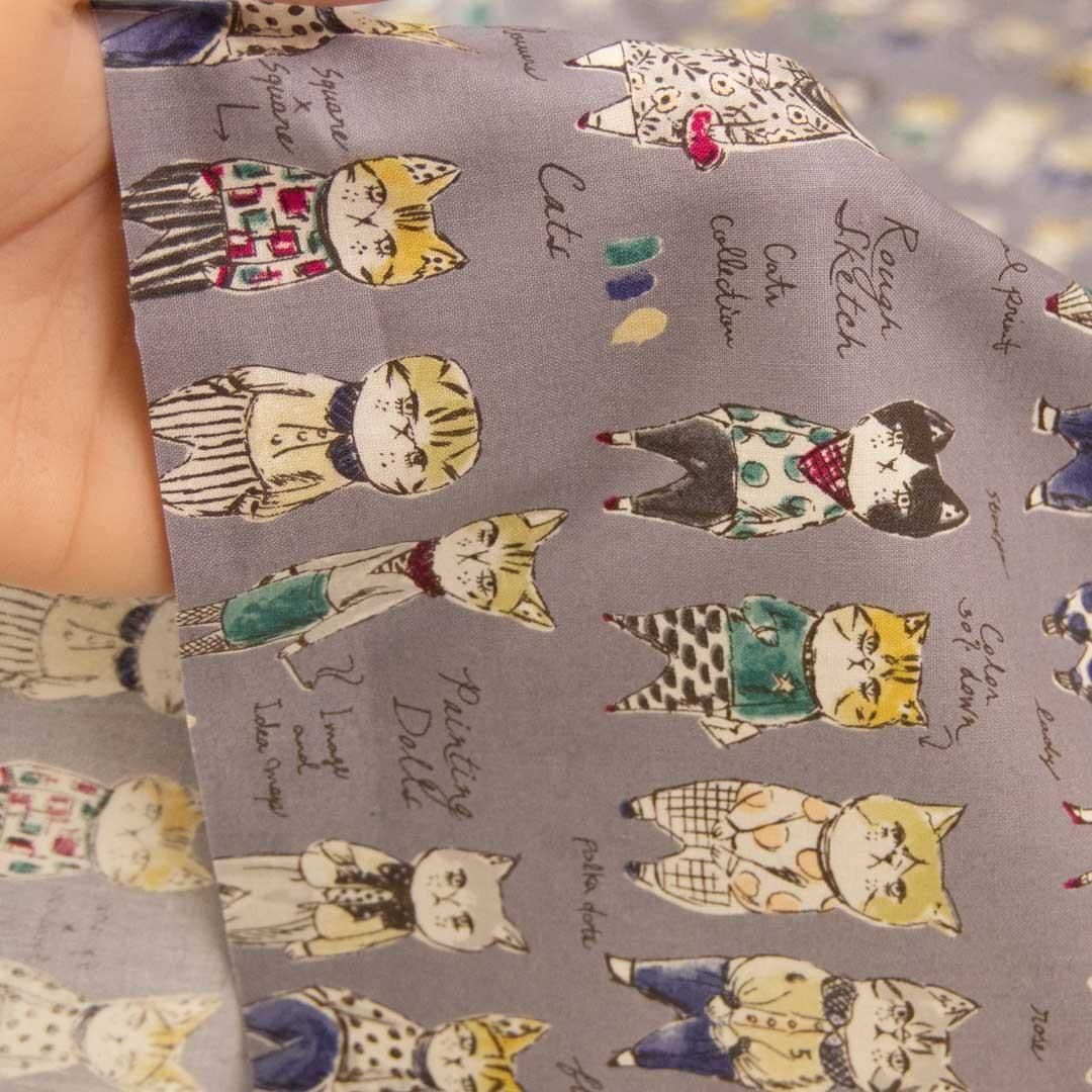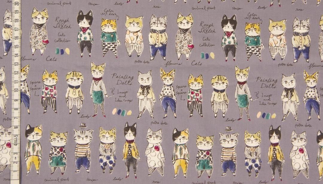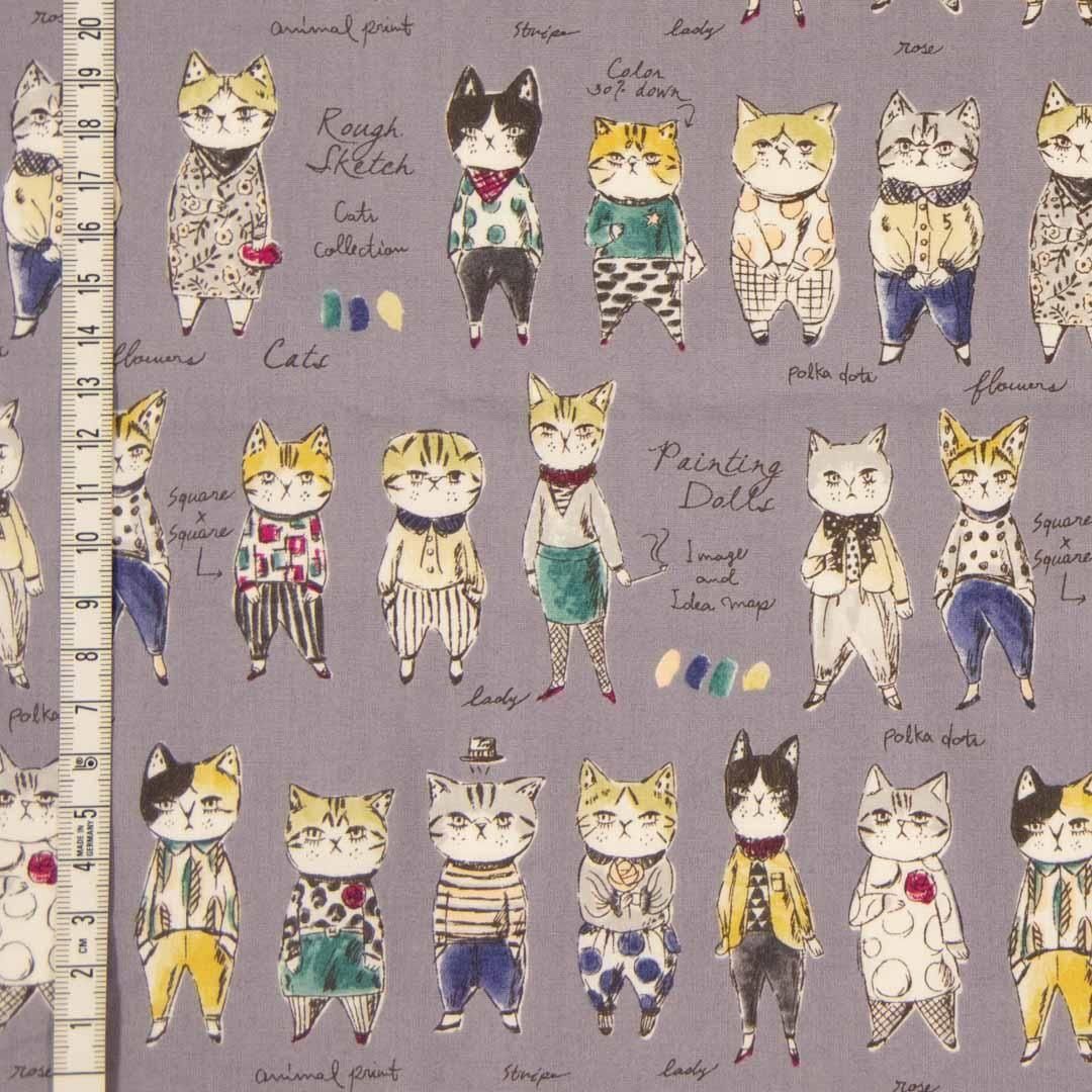 手描きスケッチ風のタッチで描かれた、ファッション好きのネコたちがずらりと並ぶコットンシャーティング