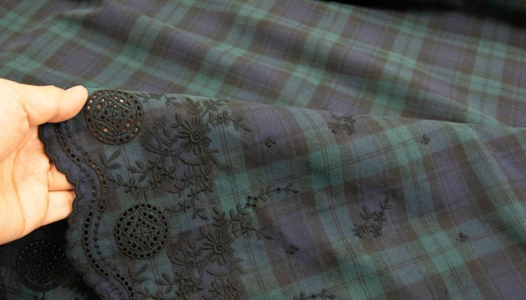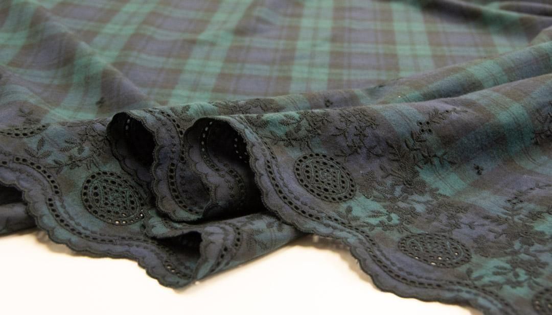 先染めで織り上げたチェック生地に、サークルやお花のモチーフでスカラップレースにしあげました。