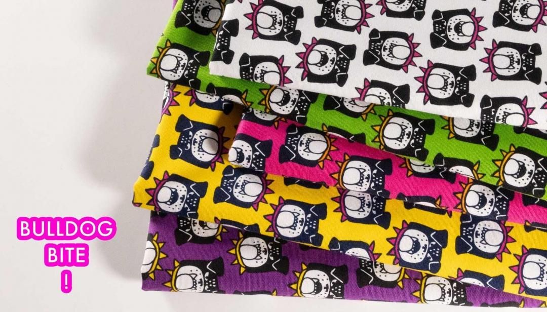 ポップな配色で描かれた、ちょっとコワくてクセになるブルドッグフェイス。